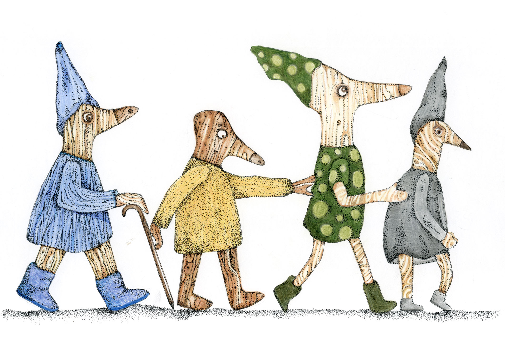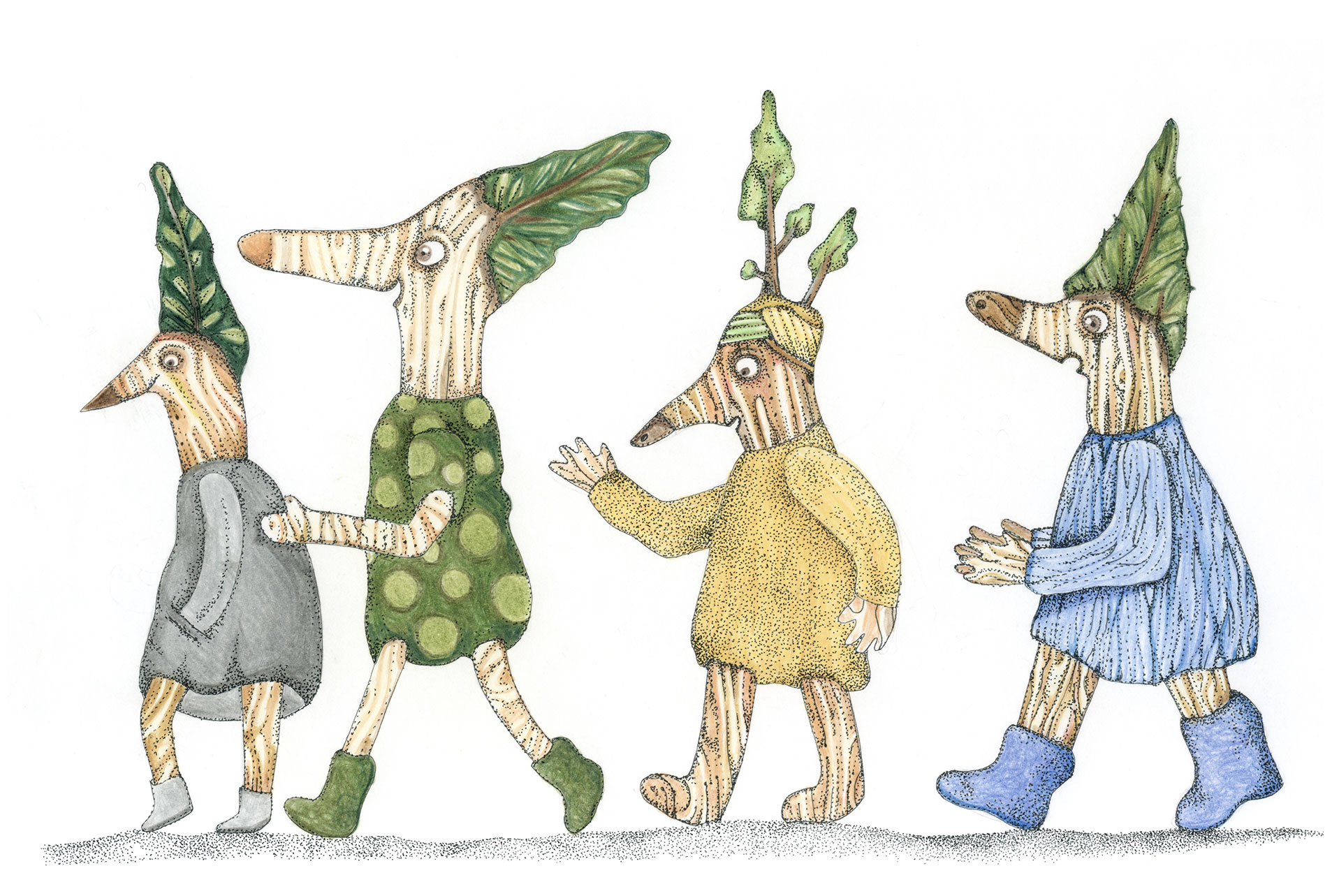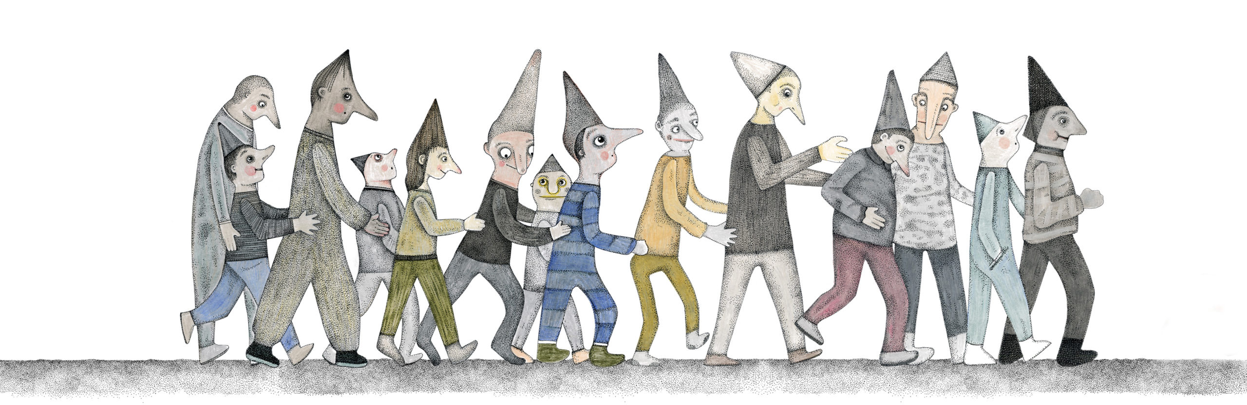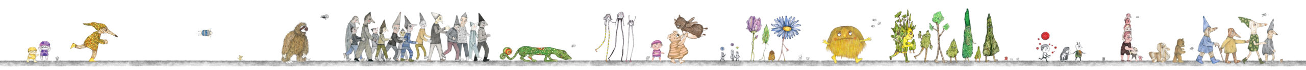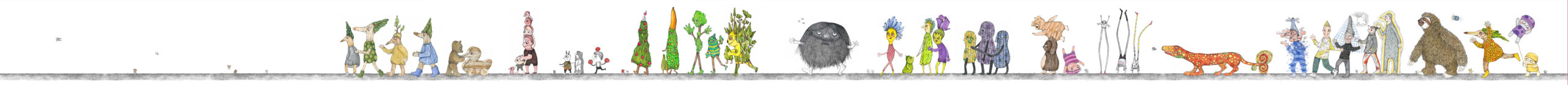 Figuren und Tiere gehen von links nach rechts. Dann – verändert oder auch nicht – kehren sie von rechts nach links zurück. Wo sind sie gewesen? Was ist in der Zwischenzeit passiert? Kehren sie überhaupt zurück und wenn nicht – Warum? Diese Arbeit war ein Teil der Ausstellung »Hin und Zurück« in der Kinder- und Jugendgalerie Weinmeister in Berlin im Jahre 2020. Beide Bilder kommen auf eine Gesamtlänge von je 430 cm.