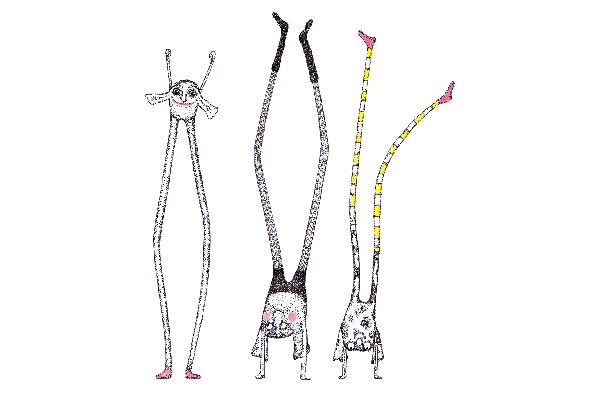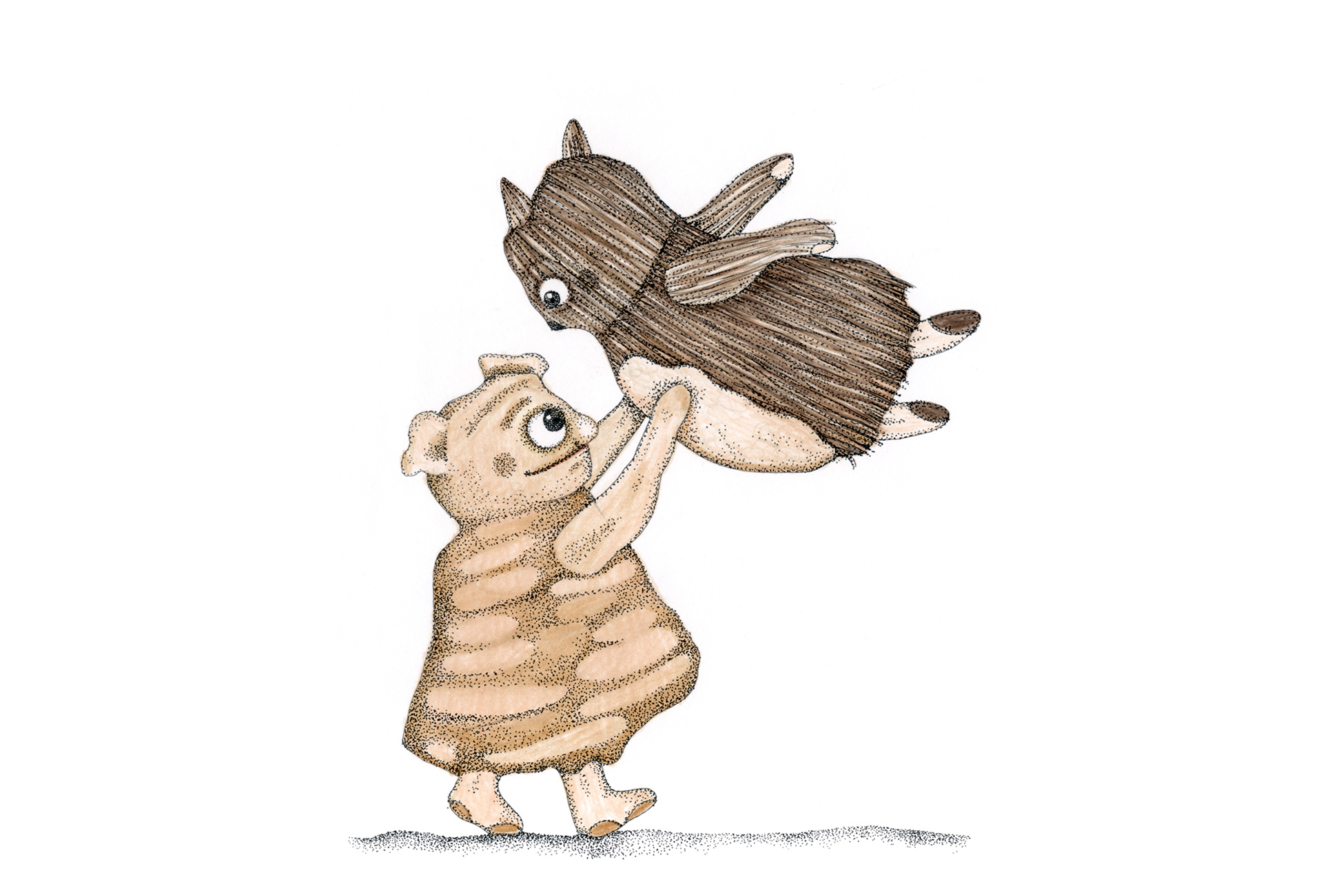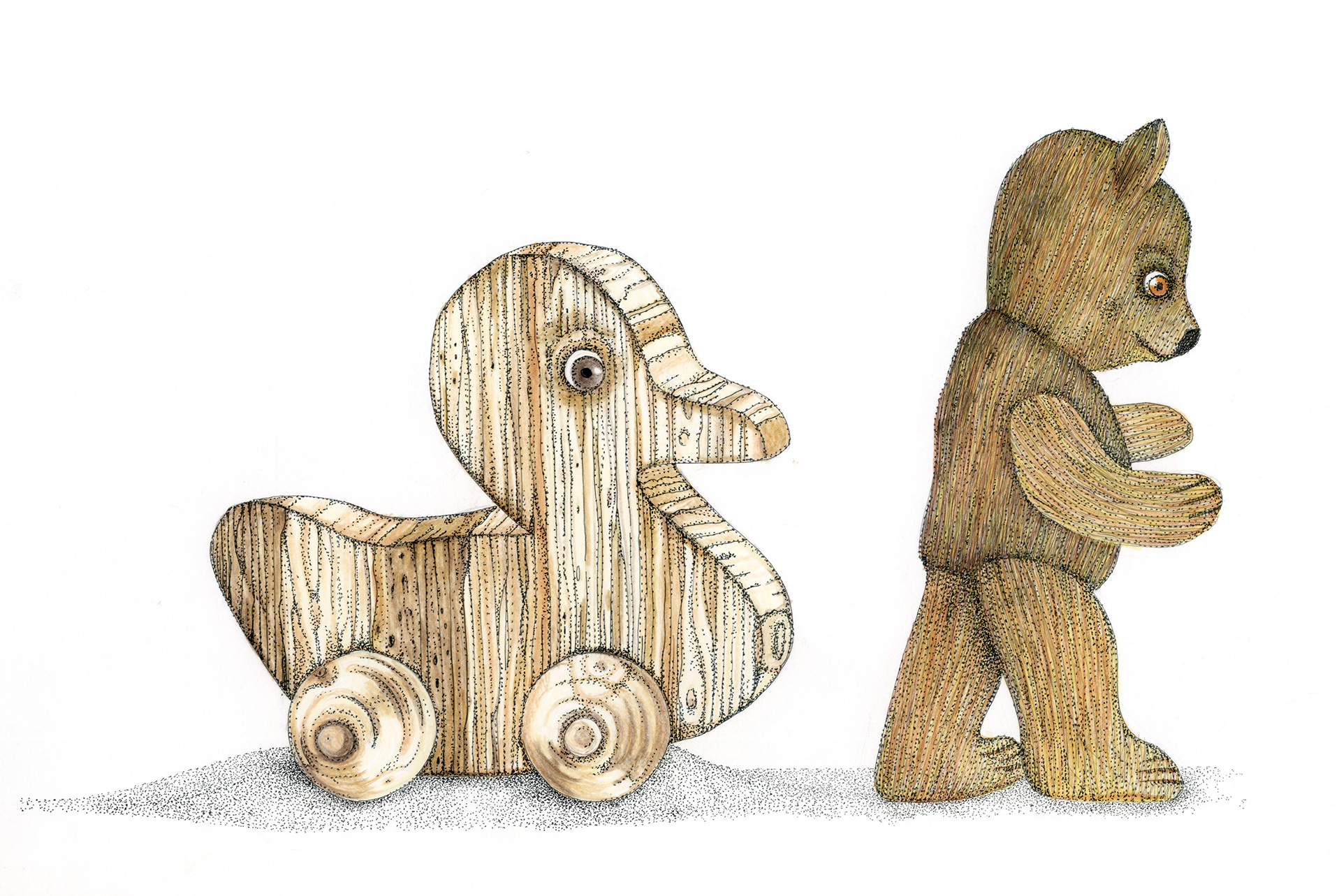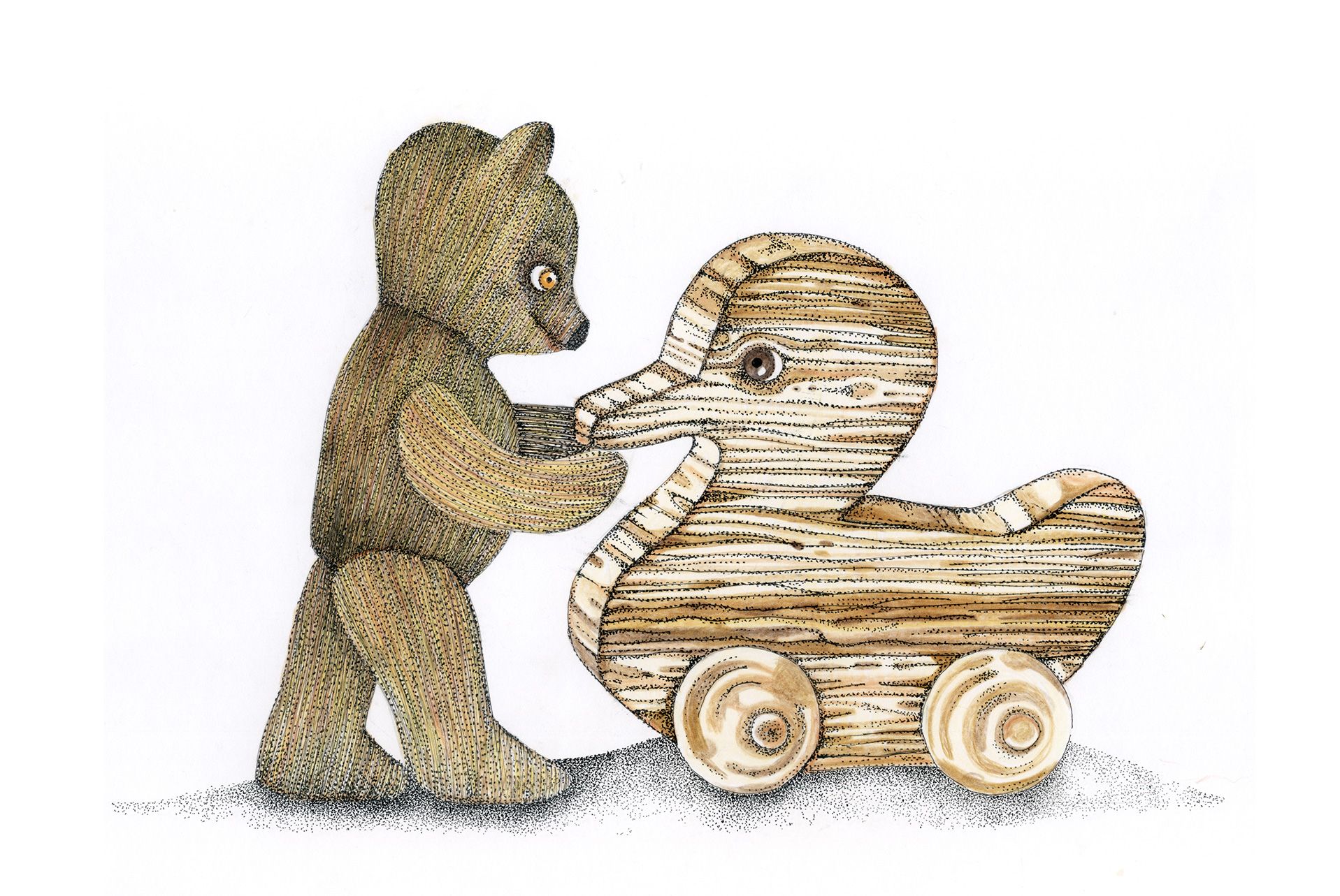 Figuren und Tiere gehen von links nach rechts. Dann – verändert oder auch nicht – kehren sie von rechts nach links zurück. Wo sind sie gewesen? Was ist in der Zwischenzeit passiert? Kehren sie überhaupt zurück und wenn nicht – Warum? Diese Arbeit war ein Teil der Ausstellung »Hin und Zurück« in der Kinder- und Jugendgalerie Weinmeister in Berlin im Jahre 2020. Beide Bilder kommen auf eine Gesamtlänge von je 430 cm.